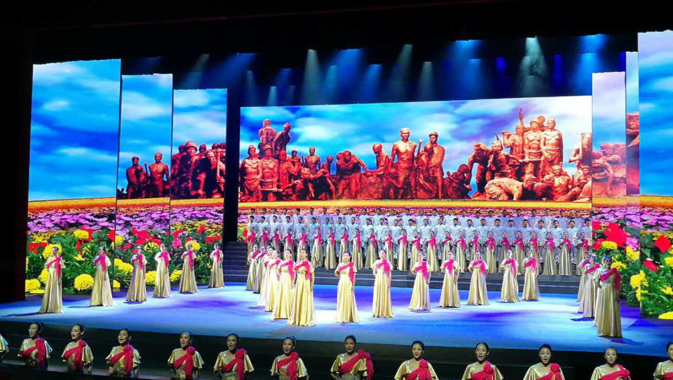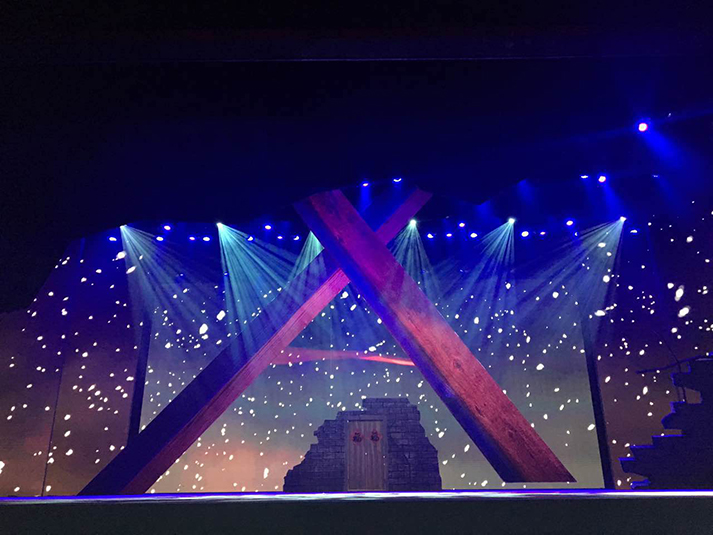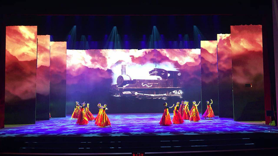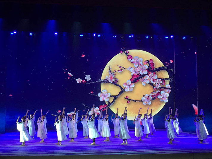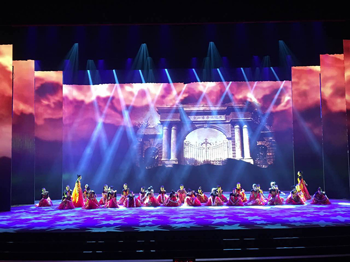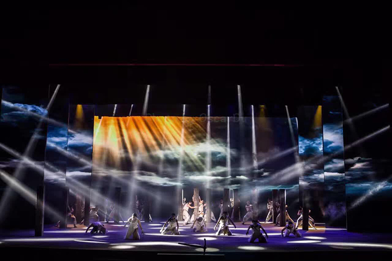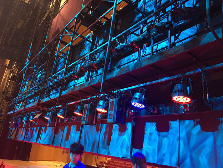 "我从舞台剧的灯光设计思路出发,用沿幕把所有灯具在舞台上隐藏起来,使观众看不见灯具只看见色彩和光线。这次晚会共采用了80台1500w图案灯(特宝丽V2500S)、60台1500w染色灯、120台光束灯(特宝丽PT320B)、160台LED灯、40台切割灯(特宝丽V3000P)以及4台追光灯(特宝丽FS300M)。切割灯特宝丽V3000P主要做面光使用,用于把舞台多余的光切掉,使舞台更干净更透亮,同时也让演员和舞美道具等清晰可见。“小钢炮”浩洋光束灯PT320B主要用于打造炫目的舞台效果;我在设计中将图案灯里面的图案与染色灯的色彩功能充分叠加之后铺照在舞台上,这种方式能够呈现出更加缤纷和绚丽的图案效果;地流灯和侧光的运用则让每一位演员都在舞台上呈现更加立体。