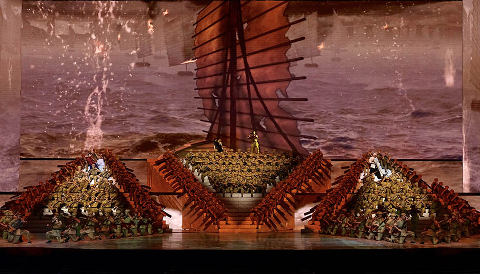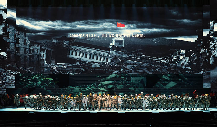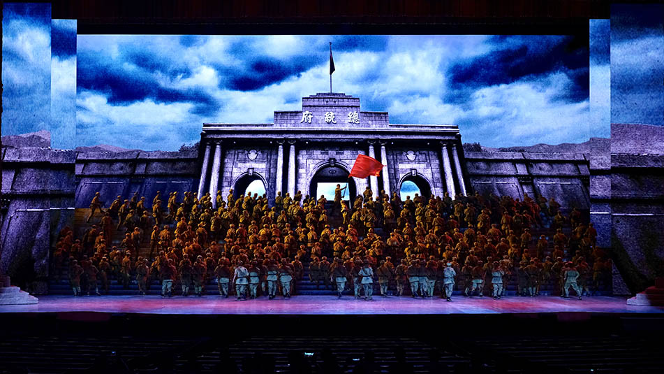 舞台上舞美布景与灯光、视频、投影等舞台视觉形式的有机融合是晚会的亮点与难点。如此豪迈气概的演出得益于晚会阵容强大的幕后团队:总导演杨笑阳、舞美总设计孙天卫、灯光总设计沙晓岚、音频总设计何飚再加上其他行业精英成员强强联合,以舞美、灯光、音响、投影、视频、舞台机械等多种舞台手段,呈现出恢弘壮丽的舞台效果。