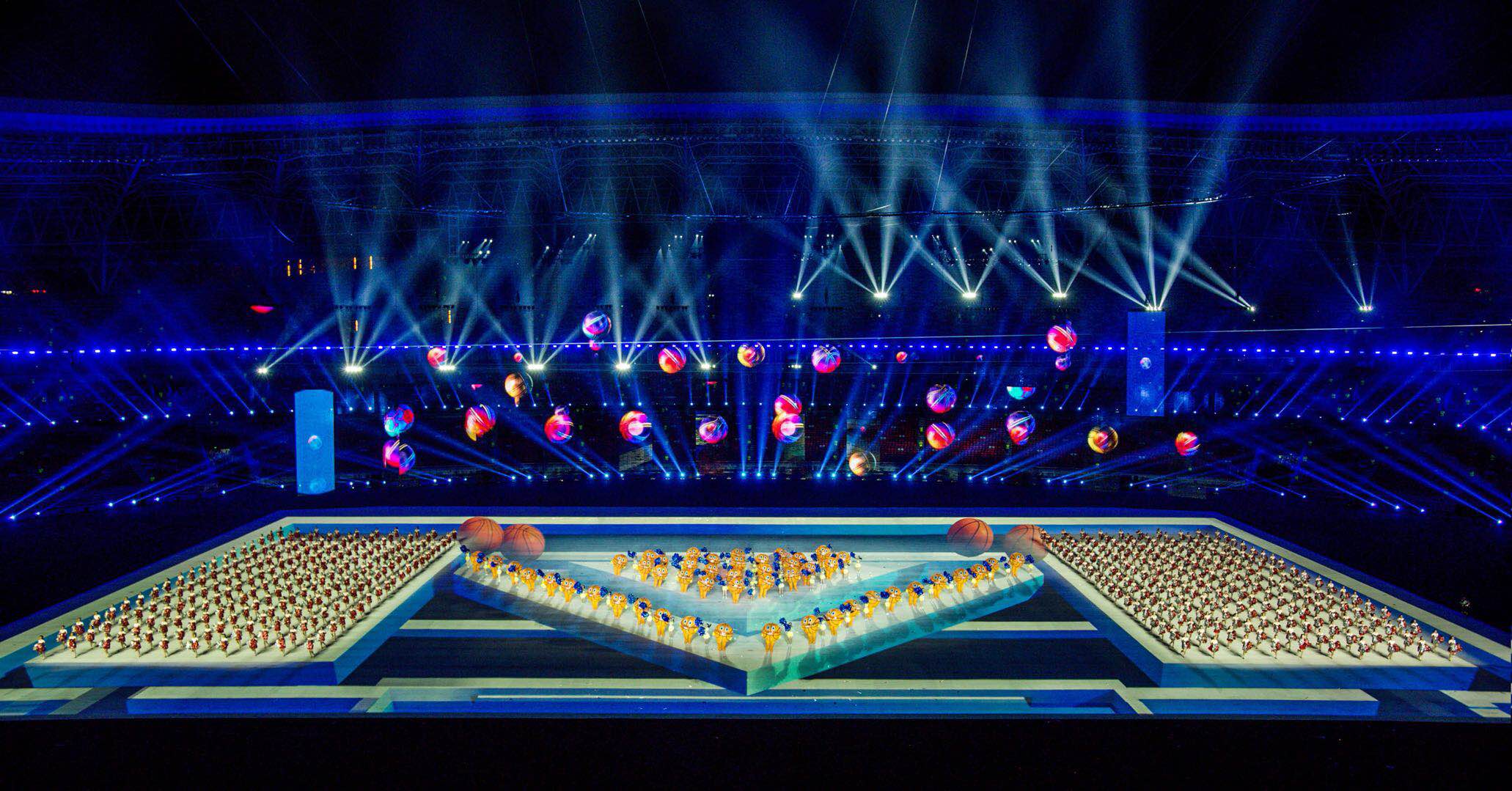 运动会开闭幕式整体设计的核心理念为“奋斗幸福观”,开幕式的主题为“奋斗新时代“,闭幕式将以“幸福新征程”为主题与之呼应。开幕式演出运用了大型灯光设备、舞台机械装置、高清投影设备、悬挂表演装置、先进音响设备、空中飞行设备等多种技术手段,形成地面、舞台、空中三维艺术呈现形式,将中国传统文化与国际先进科技进行完美结合,形成一台国际化高水准的全景化演出。