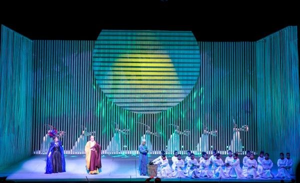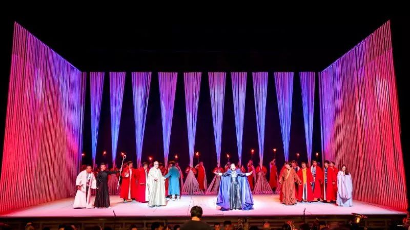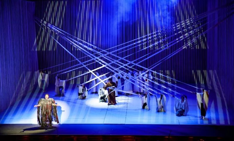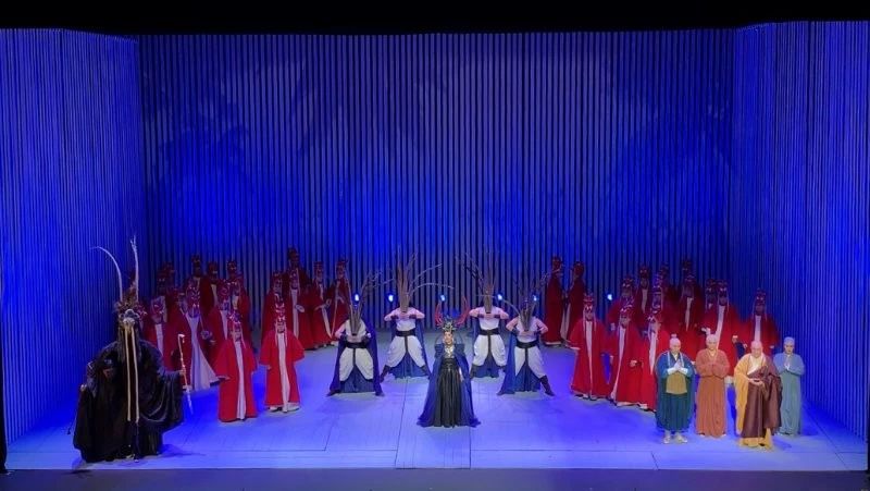 与一般的歌剧戏剧结构方式有所不同,歌剧《鉴真东渡》有着不拘泥情节意识流般的戏剧铺陈,通过多元的音乐并列和抽象的舞台写意呈现,着力渲染表达鉴真内心的情感波涛和人生理念。