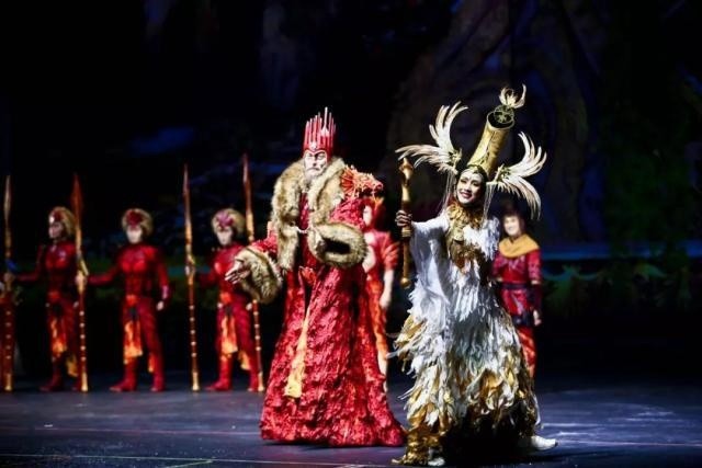 演出中的很多形象都有着东西方文化的双重印记。主人公的形象既能让观众联想到孙悟空也带着西方传统神话的人物印记。剧中有东西方两个王国,西方的是以龙和红色元素来代表,而东方的则以凤凰和金色元素来代表。
