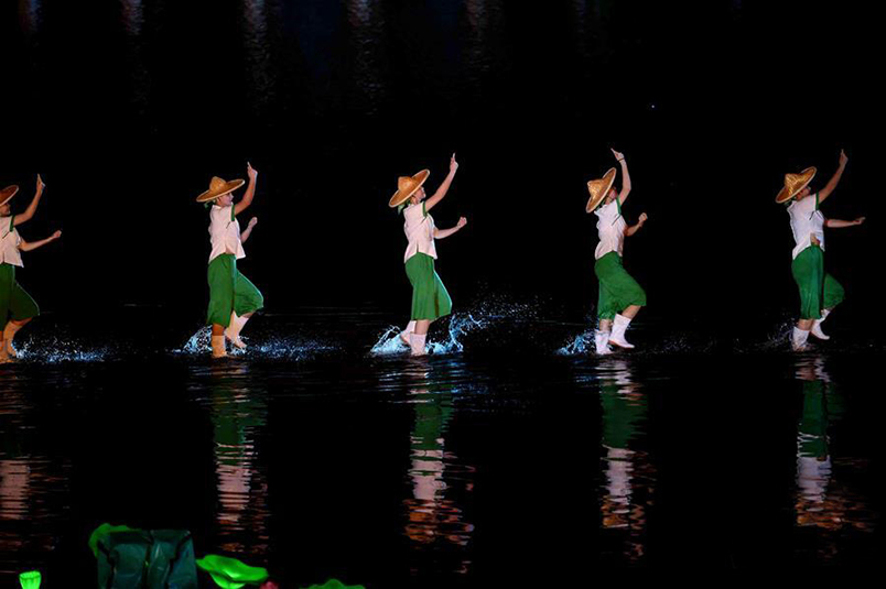由于实景演出的舞美要求不能破坏大自然的原始形态,因此现场对视觉效果的塑造都押在了灯光创作上,由于现场表演规模宏大,尤其是在水面上染色,要做到色彩单纯,光线分布均匀且具备足够的亮度,同时保证远景、近景的清晰可见,给观众带去强烈的视觉感受。