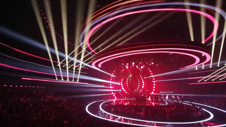浩洋电子切割成像电脑灯V3000P拥有领跑行业的精准切割效果,能够平滑、自然的切割出多种图案,均匀顺滑的CMY混色系统、0-100%线性调光和柔光雾化效果,可呈现出如呼吸般自然的光色变幻。这款成功服务过南京青奥会、APEC峰会和多届央视春晚的顶级切割电脑灯,在歌会现场也被用作各种场景的切割造型和人物面光处理,配合浩洋电子经典款图案灯V2500S,给观众带去亦真亦幻的震撼视觉享受。