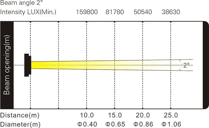 光斑角度:2°,独特的光路结构使光束效果更强更亮