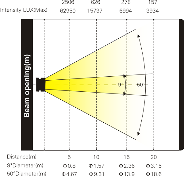 成像盘:一组由4个切角片组成可控制的光斑切角系统,整个切角系统可做90°旋转,通过对切光片的精准控制,可创造出任意方向的三角形,菱形,长方形等光斑形状