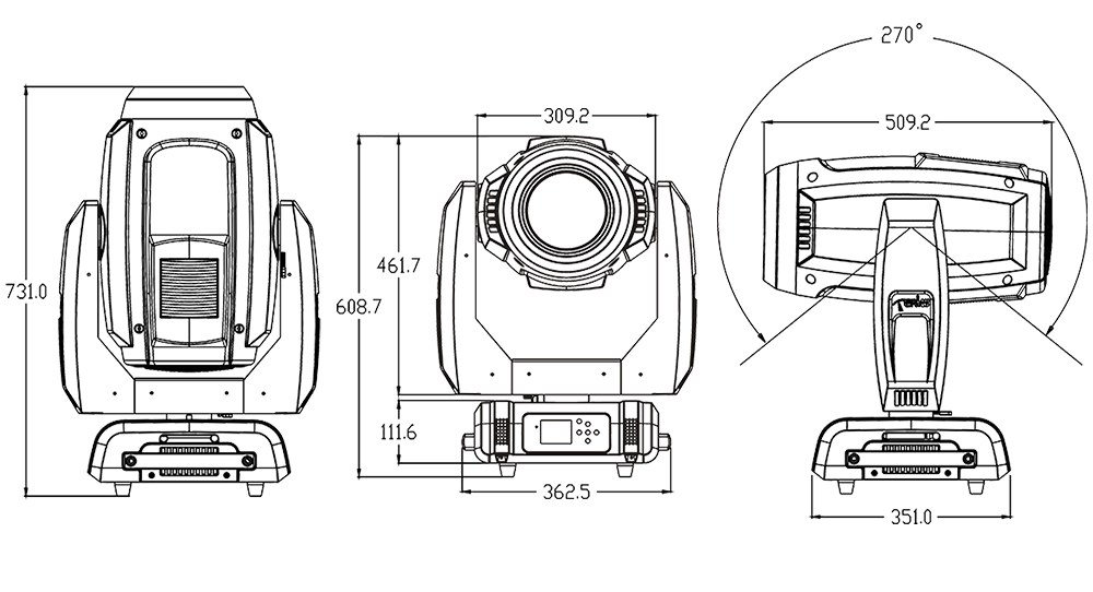 可从控台完成更改DMX地址码,遥控开关灯泡,机器重设,声控模式的转换等功能