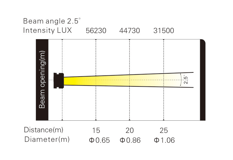 光斑角度:2.5°,独特的光路结构使光束效果更强更亮