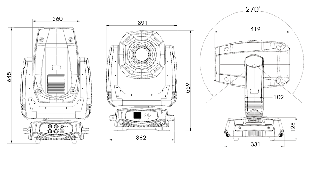 可从控台完成更改DMX地址码,遥控开关灯泡,机器重设,声控模式的转换等功能