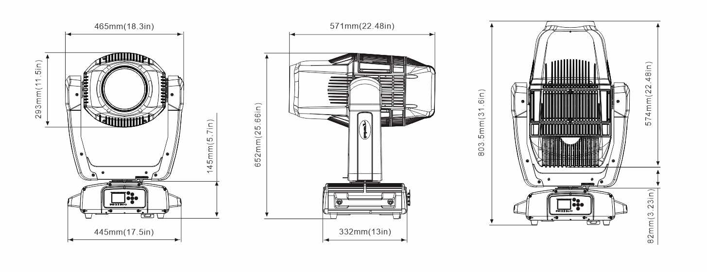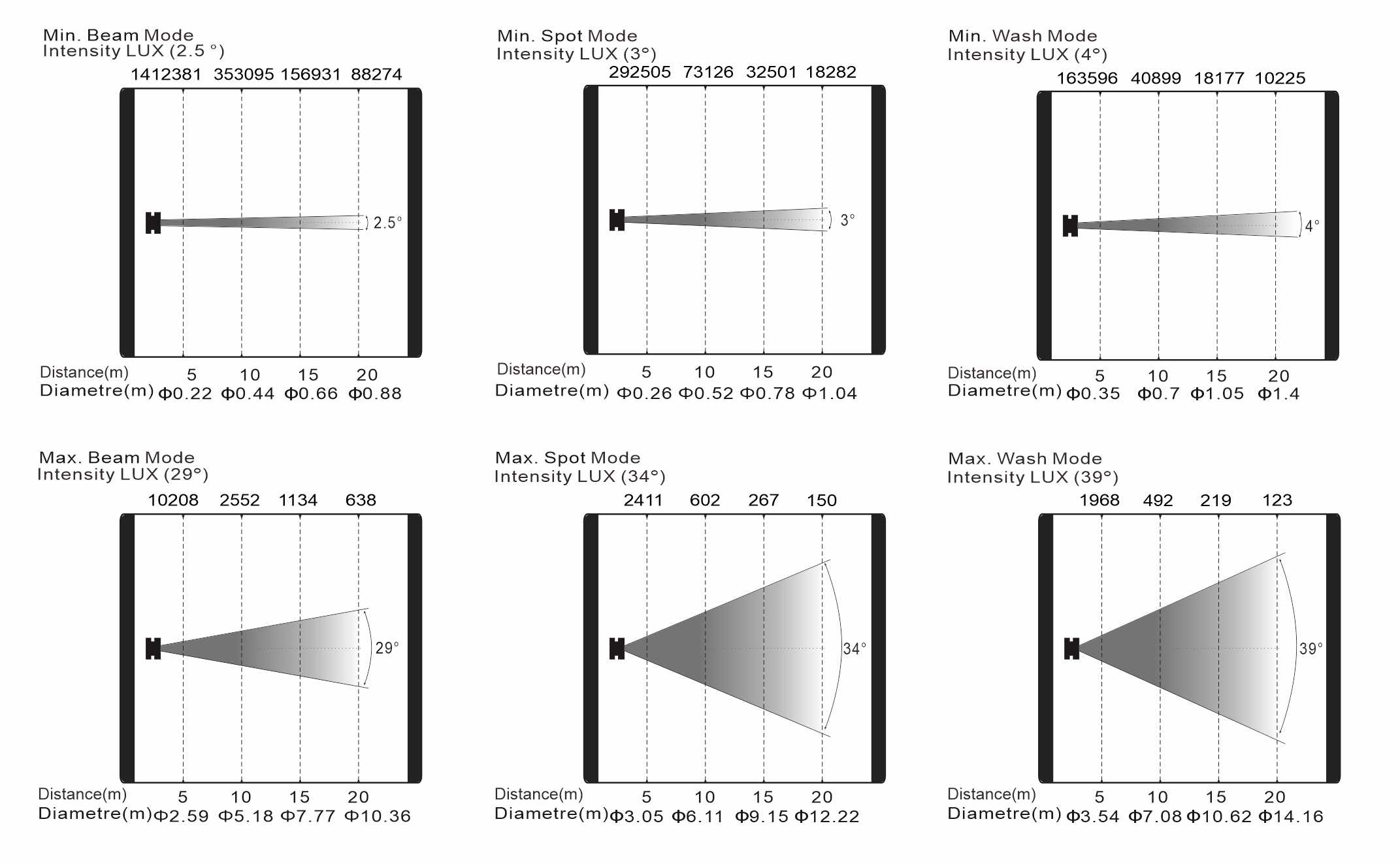 变焦范围:光束模式:2.5°-29°;图案模式:3°-34°;染色模式:4°-39°