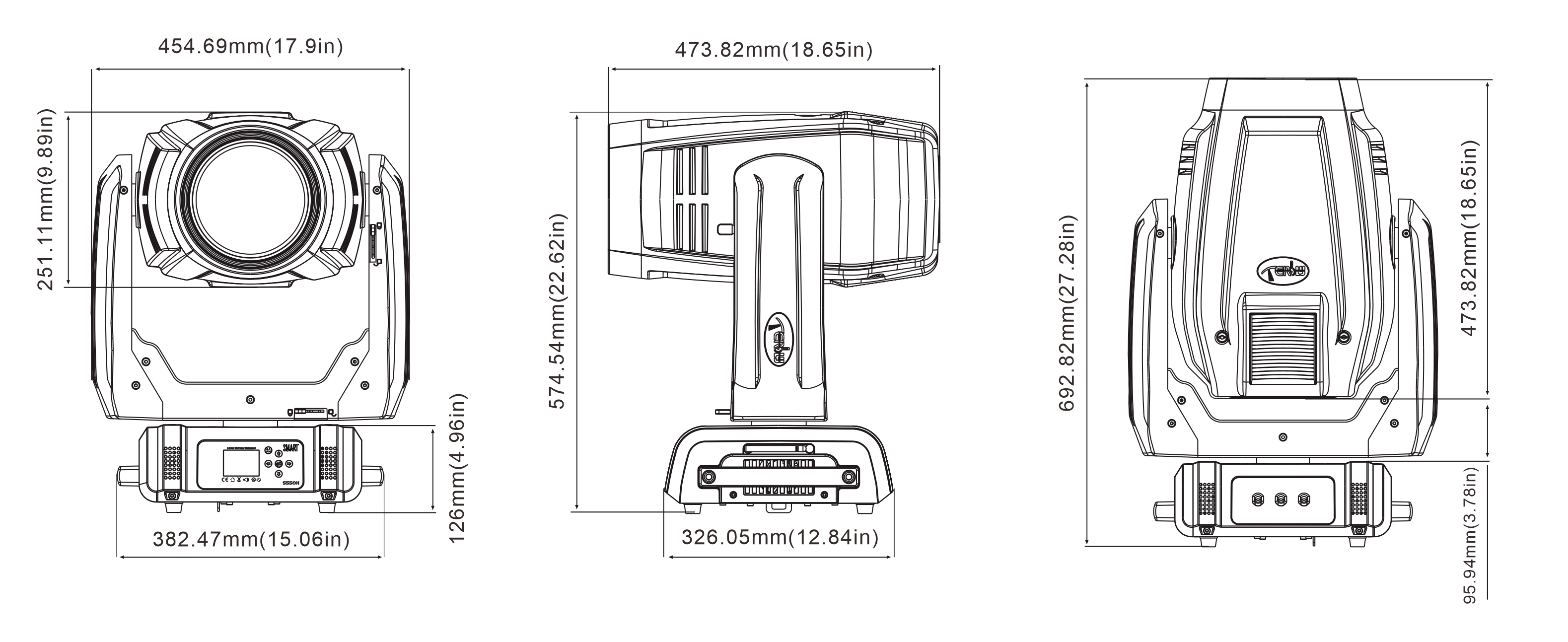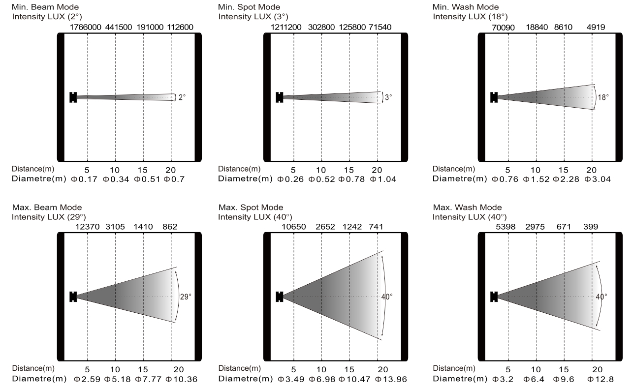 变焦范围:光束模式: 2°-29°, 图案模式: 3°-40°, 染色模式: 18 -40°