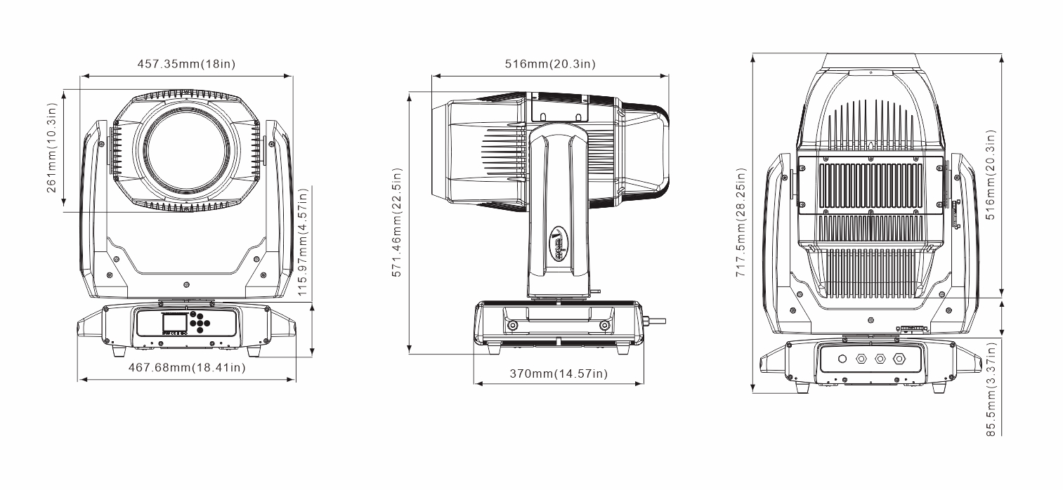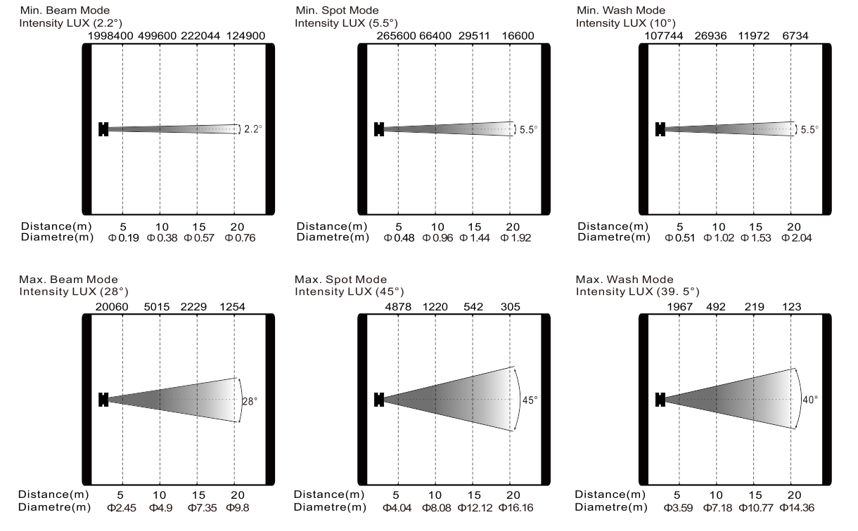 变焦范围:光束模式: 2.2°- 28°,图案模式: 5.5°- 45°,染色模式: 10°-40°
