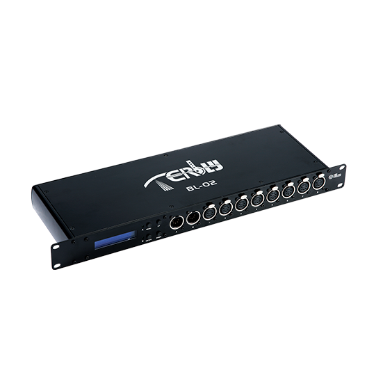 信号从A、B两个信号端口输入,可以转置为由8个单独输出端口或4个一组的两组输出端口的DMX512标准信号通道,而且具备加强放大信号的功能。