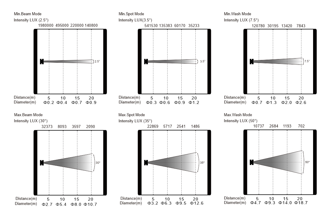 变焦范围:光束模式:2.5°-30°,轻柔光模式:3.5°-35°,重柔光模式:7.5°-50°