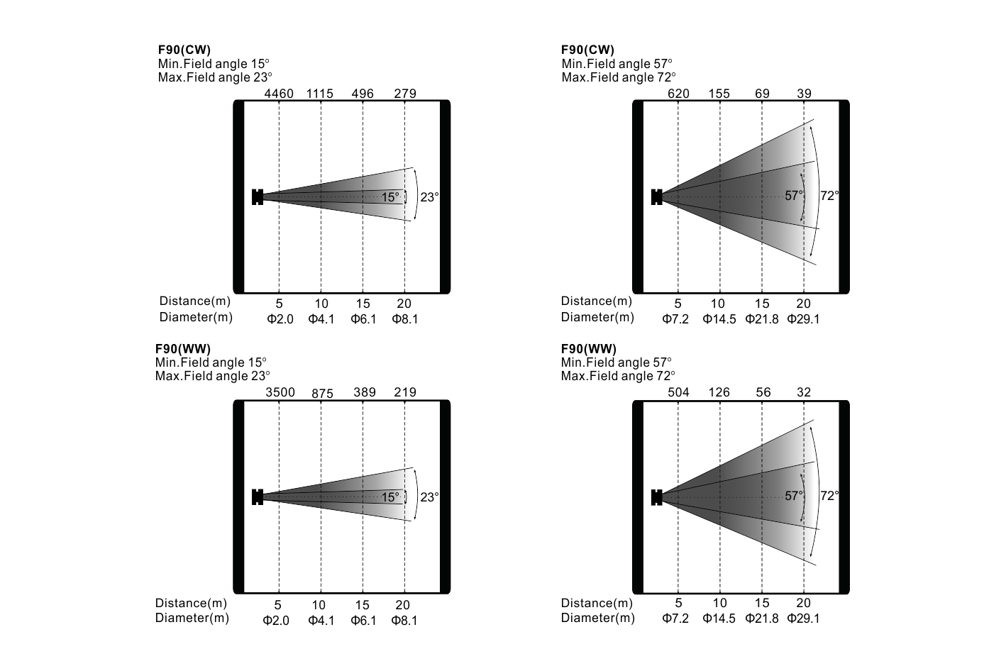 放大:光束角:15°-57°,光斑角:23°-72°,4倍电动线性变焦