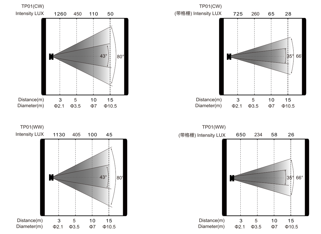 变焦范围:光束角度:43°(可选格栅 35°),光斑角度:80°(可选格栅 66°)